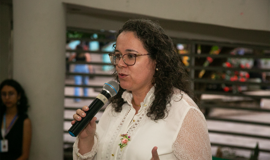 Professora Dra. Luciana Teixeira discursando na cerimônia de inauguração do banco