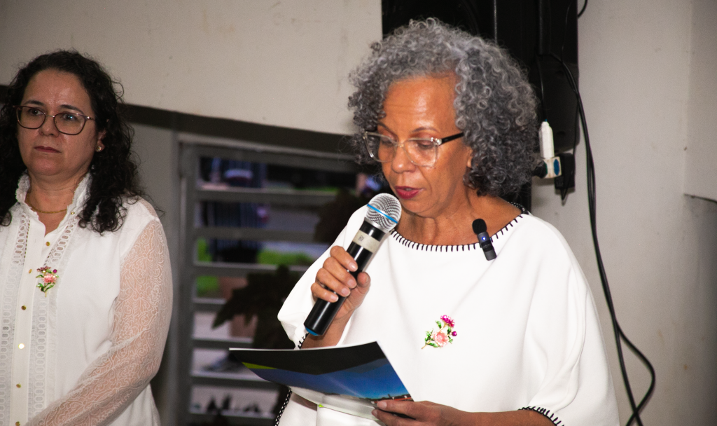 Em seu discurso, a professora Marinalva leu um texto de sua própria autoria, refletindo sobre as conjunturas e os desafios de uma educação voltada para a formação de indivíduos pensantes, críticos e atentos ao combate às inequidades de gênero presentes na sociedade contemporânea.